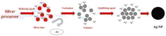 Chemical reduction is based on a metal salt source which is reduced with reducing and stabilized agents. Among different silver sources, silver nitrate (AgNO3) and silver perchlorate (AgClO4) [69] are the most used. Reducing agents have an important role in this method due to their correlation with nanoparticle shapes. Glucose (C6H12O6), ethylene glycol (C2H6O2), and sodium borohydride (NaBH4) [69] are reducing agents which act in the reduction of Ag2+ to Ag0 during the process. These reagents involve the transformation of precursors in metallic silver (Ag0), which will induce the formation of clusters by agglomeration. The clusters are further grouped to form colloidal silver nanoparticles [81]. To be maintained and perform the reaction in the best conditions, stabilizing agents must also be present. They have the role of stabilizing the nanoparticle’s suspension while nanoparticles are formed and avoiding a possible agglomeration of particles. The mechanism of such reactions is depicted in Figure 3.