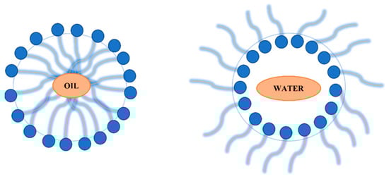 Microemulsions showed interest in silver nanoparticles synthesis over time. The possibility of producing uniform and controllable sizes of silver nanoparticles led to the investigations of this method. Microemulsions are isotropic solutions with good homogeneity and thermodynamically stable and made up of three components: a polar phase (water), a nonpolar phase (oil) and a surfactant [90,91]. Their low interfacial tensions, large surface area, high stability and capacity to work with immiscible agents are advantages taken into consideration in the nanoparticles synthesis [92]. The surfactant is found between the polar phase and the non-polar phase forming a “layer” observed at the microscopic scale. With the surfactant found at the interface of the two layers, microemulsion can be made in two ways: drop by drop of oil in a continuous water phase, known as oil–water micro-emulsification or droplets of water in a continuous oil phase, known as water–oil micro-emulsification. Differences can be observed in Figure 4 where both methods are represented [90].