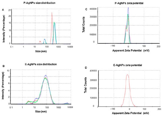 The conditions of chemical reactions can influence not only their shape but the size, as well. Another study proved that nanoscale particles are obtained using certain reducing agents and stabilizing agents. Zielinska et al. [83] proposed the synthesis of silver nanoparticles using ascorbic acid, hydrazine and sodium borohydride as reducing agents and PVA or PVP as stabilizing agents. The results revealed that using PVP as stabilizing agent together with ascorbic acid or hydrazine as a reducing agent led to nanoparticle dimensions between 30–80 nm. On the other hand, PVA used as a stabilizing agent led to some smaller particles, the range of dimensions being between 44–48 nm. The biggest particles were identified when sodium borohydride was used in the chemical reactions [83]. These experiments revealed that beside the extreme conditions that are required, sodium borohydride presents the inconvenience of producing bigger particles.
