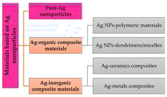 Nanoparticles can be classified through their origin and their composition. They can be found in interactions with organic particles (dendrimers, liposomes), with inorganic materials (metals in general), and with materials and particles based on carbon (graphene, nanotubes). Silver (Ag) is obtained through mechanical tries from metals, so it is classified as an inorganic material with high resistance. In this regard, a simple classification of materials based on silver nanoparticles (Ag NPs) is described in Scheme 1.