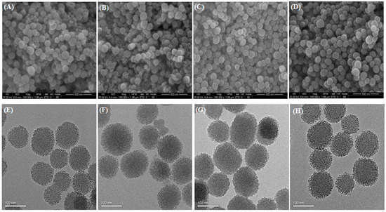 The potential controlled release characteristics of silica nanoparticles have received considerable attentions because of their application in smart delivery systems [46,47]. Recently, two differently sized FL-SiO2 NPs, FL-SiO2 NPs-0 nm and FL-SiO2 NPs-150 nm, were prepared using surfactant CTAB as a structure-directing agent, with TEOS used as a silica precursor. The carbon dots formed during the calcination process in preparation of FL-SiO2 NPs produce the stable and strong fluorescence which is essential for in vivo imagining of nanoparticles as delivery vehicles in biological systems [48,49,50]. Methoxyfenozide was loaded into FL-SiO2 NPs by simple immersion in a CH3OH solution by magnetically stirring at room temperature. In the optimum circumstances of carrier/insecticide ratio 2:1, the loading content of methoxyfenozide was calculated up to 15% and 16%. The structural and morphological characters of the two sizes of FL-SiO2 NPs and Me@FL-SiO2 NPs were checked under TEM and SEM (Figure 1).