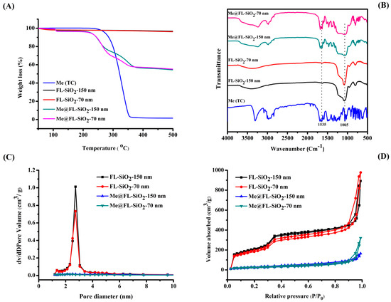 Figure 2. TGA curves (A), FT-IR spectra (B), Nitrogen adsorption–desorption isotherms (C), and pore size distributions (D) of methoxyfenozide (Me), FL-SiO2 NPs-70 nm, FL-SiO2 NPs-150 nm, Me@FL-SiO2 NPs-70 nm, and Me@FL-SiO2 NPs-150 nm.