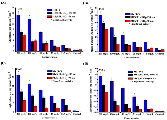 Presently, the effect of two sizes of Me@FL-SiO2 NPs (70 nm and 150 nm) and methoxyfenozide TC on the detoxification enzymes (GST, AChE, P450, and CarE) of P. xylostella was measured. As shown in Figure 5A, at all concentrations, the GST activity for P. xylostella treated with Me@FL-SiO2 NPs-70 nm and -150 nm was reduced compared to samples treated with methoxyfenozide TC. The highest GST activity was noted at the highest concentrations, 200 mg/L, of methoxyfenozide, while activity declined in the case of Me@FL-SiO2 NPs (70 nm and 150 nm) at the same concentrations. According to Bilal [32], GST played an important role in resistance development in P. xylostella against indoxacarb TC, while reduction in activity was observed in the case of indoxacarb-loaded fluorescent silica nanoparticles (IN@FL-SiO2 NPs). Similarly, GST activity also declined in treated D. magna with various concentrations of CuO NPs and ZnO NPs. Previous studies and our results confirmed that nanoparticles or nano-formulations of insecticides could change enzyme activity [32,64].
