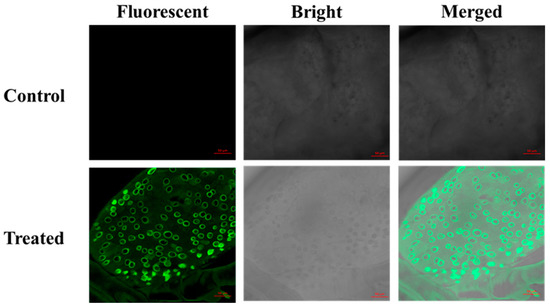 CLSM was used for imaging of the presence of fluorescent silica nanoparticles in the dissected midgut of treated P. xylostella with FL-SiO2 NPs. It was also treated with water as control and checked under CLSM to compare with samples treated with FL-SiO2 NPs. The treated larvae exhibited a strong fluorescence as compared with the control group, which were without fluorescence under a laser excitation wavelength of 448 nm, as shown in Figure 6. Previously, CLSM showed similar results to confirm the presence of amorphous silica nanoparticles in the midgut of D. melanogaster, while no fluorescent signals were exposed from the control group [72]. CLSM was also used to observe the toxicity of SiO2 NPs in initial stages of embryo formation in Xenopus laevis [73].