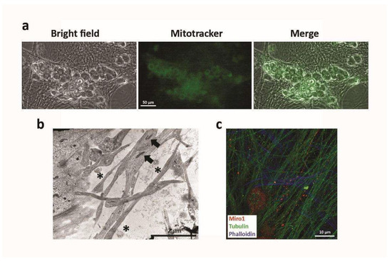 - Ahmad, T.; Mukherjee, S.; Pattnaik, B.; Kumar, M.; Singh, S.; Rehman, R.; Tiwari, B.K.; Jha, K.A.; Barhanpurkar, A.P.; Wani, M.R.; et al. Miro1 regulates intercellular mitochondrial transport & enhances mesenchymal stem cell rescue efficacy. EMBO J. 2014, 33, 994–1010. [Google Scholar] [CrossRef]