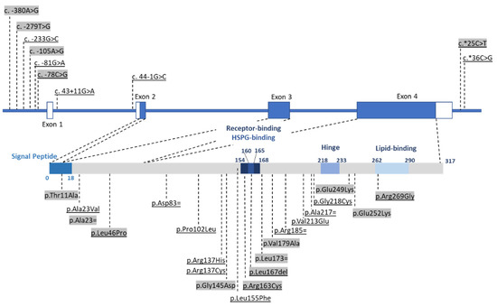 Variants were designated according to the Human Genome Variation Society recommendations (HGVS; https://www.hgvs.org/mutnomen, accessed on 6 November 2021). cDNA was numbered from +1 for A in the ATG translation initiation codon of the reference sequence (NM_000041.4). Amino acid residues were numbered from +1 for the initiating methionine of the protein sequence (NP_000032.1). Hence, 18 was added to the original numbering for ApoE corresponding to the 18 residues forming the signal peptide.