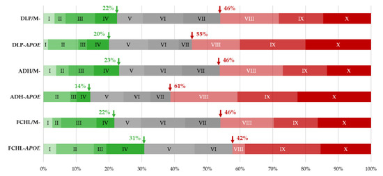 Distribution of the 12-SNP weighted polygenic risk score (wPRS) within the deciles of the Whitehall II control cohort [7]. Comparison between dyslipidemic (DLP = ADH/FCHL), ADH, or FCHL probands carrying an APOE rare variant or without any ADH/FCHL causative mutation (/M-). Green arrows indicate the percentage of probands with a low wPRS and a probability of monogenic DLP that gradually increases under decile V. Red arrows indicate the percentage of probands with a wPRS in the top three deciles with a high probability of polygenic DLP.