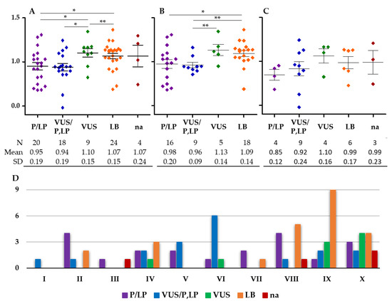 - Richards, S.; Aziz, N.; Bale, S.; Bick, D.; Das, S.; Gastier-Foster, J.; Grody, W.W.; Hegde, M.; Lyon, E.; Spector, E.; et al. Standards and guidelines for the interpretation of sequence variants: A joint consensus recommendation of the American College of Medical Genetics and Genomics and the Association for Molecular Pathology. Genet. Med. 2015, 17, 405–423. [Google Scholar] [CrossRef] [PubMed]