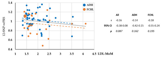 ADH and FCHL probands of European origin were recruited between 2012 and 2020 through the French National Research Network on Hypercholesterolemia which includes 38 clinicians from all over France. The ADH inclusion criterion was total and LDL-C values above the 90th percentile when compared to sex- and age-matched European populations [20,21]. This corresponded to a TC-MoM (see below) above 1.2 and a LDL-MoM (see below) above 1.3. The FCHL inclusion criteria were: total cholesterol and TG values above the 90th percentile when compared to sex- and age-matched European populations [41,42]. This corresponded to a TC-MoM (see below) above 1.2, and a TG-MoM (see below) above 2.0. For patients on regular treatment for whom pre-treatment values were not available, the untreated LDL-C value was estimated using the correction factors for statins ± ezetimibe medication given by a meta-analysis of 71 reports [34].