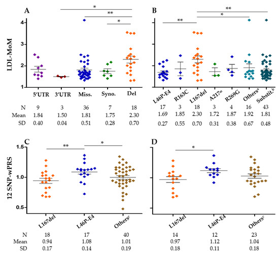 The most frequent variant in this cohort, p.Leu167del, is known as a causative mutation in ADH [9] and is the one associated with the more severe phenotype (Figure 5). The p.Leu167del variant is known to cause hypercholesterolemia in 3.1% of ADH subjects without LDL, APOB, and PCSK9 mutations in Spain [28] and a French patient among a cohort of 229 ADH subjects [10]. The hyperLDLemia observed in the French ADH family with p.Leu167del carriers was explained by an increased LDL pool, which was the consequence of an increase in VLDL production rate and a decrease in LDL catabolism [9]. Another study showed that VLDL carrying the p.Leu167del variant produces LDL receptor downregulation resulting in increased plasma LDL-C [28]. We find in this ADH/FCHL cohort that p.Leu167del carriers are characterized by significantly higher LDL levels compared to all other APOE variant carriers. This is mainly due to lower LDL levels of p.Leu46Pro/E4 carriers (Figure 5B).