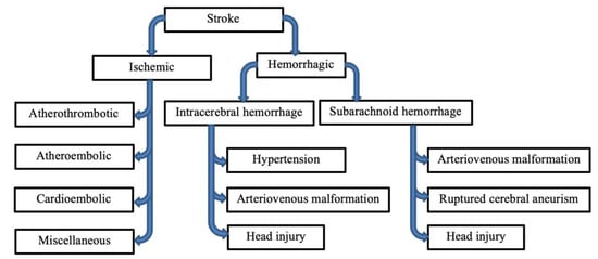 Stroke is a multifactorial disease consisting of various pathologies and etiologies and requires precise diagnosis to differentiate the patient’s symptoms from other conditions that present similar symptoms []. Additionally, it must be determined if the type of stroke is hemorrhagic or ischemic []. Hemorrhagic stroke occurs when a patient suffers from ruptured intracranial vessels, resulting in inflammation and compression that cause neural death. Hemorrhagic stroke is divided into subarachnoid hemorrhage (SAH) and intracerebral hemorrhage (ICA). The main causes of SAH and ICA are arteriovenous malformation (AVM), ruptured cerebral aneurism (RCA), head injury and hypertension (HTN). Ischemic stroke can be divided into several subcategories: atherothrombotic, atheroembolic, cardioembolic, and miscellaneous (Figure 1).