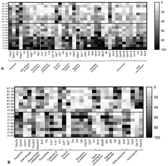 Heat maps of individual gene expression data in the hippocampus of 10 transgenic AT mice and 8 WT controls (A) and in the whole blood of 9 AT mice and 7 WT controls (B). Genes with |FR| > 1.5 and p < 0.05 in AT mice vs. WT controls are shown. Data are presented as 2−ΔCT values and are scaled considering the highest value as 100%. Genes that are over-expressed in AT mice appear in dark tones in this group and in lighter tones in the control group. Genes that are under-expressed in AT mice appear in dark tones in the control group and lighter tones in diseased mice. NFkB target genes are marked with *, while redox-responsive genes are marked with #.