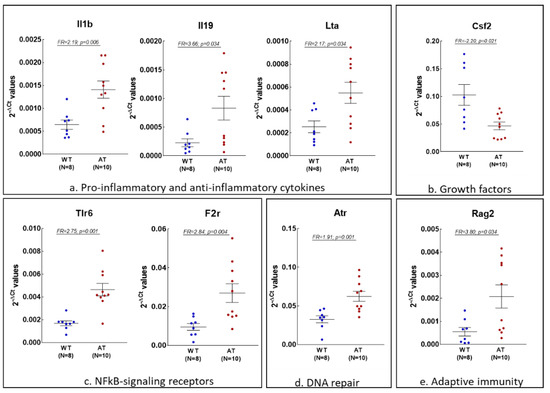 Inflammation and redox-related genes differentially expressed in the whole blood of AT mice (N = 9) vs. WT mice (N = 7), exhibiting |FR| values > 1.8. Data are presented as 2−∆CT values, and lines represent the expression average ± standard error of the mean (SEM). Comparisons between mice groups were made using the Mann–Whitney U-test, and differences were considered significant for p < 0.05.