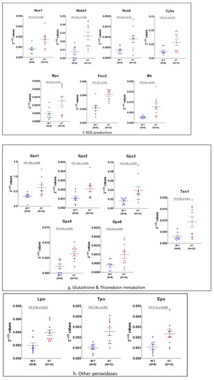 In the hippocampus of AT mice, we identified seven up-regulated genes (Figure 2a,c–e) that encode cytokines (Figure 2a: the pro-inflammatory Il1b and Lta, along with the anti-inflammatory Il19) or growth factors (Figure 2b: Csf2), NFkB signaling receptors (Figure 2c: Tlr6 and F2r), molecules involved in DNA repair (Figure 2d: Atr) or gene rearrangement in antigen receptors specifically expressed by B or T lymphocytes (Figure 2e: Rag2). In the array of inflammation genes, only Csf2, encoding the granulocyte-monocyte colony-stimulating factor (GM-CSF) was under-expressed (Figure 2b). We also found 16 up-regulated redox genes fulfilling the same criteria in the hippocampus of AT mice (Figure 2f–h). Parts of these genes encode molecules involved in ROS production (Figure 2f), such as NADPH-oxidase components (Nox1, Noxa1, Nox4 and Cyba) and myeloperoxidase (Mpo), along with the NADPH-dependent dimethylaniline monooxygenase (Fmo2) and the myoglobin oxygen transporter (Mb). The transcript levels of some antioxidant genes were also found to be elevated (Figure 2g), comprising genes that encode glutathione peroxidases (Gpx1, 2, 3, 5 and 6) or thioredoxin (Txn1). In addition, three genes encoding peroxidases other than myeloperoxidase and glutathione peroxidases were found to be up-regulated as well (Figure 2h: Lpo, Tpo and Epx).