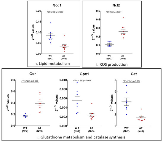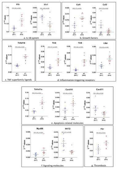 In the blood of AT mice, we identified 15 inflammation genes with |FR| values > 1.8 (p < 0.05), related to the NFkB signaling pathway (Figure 3a–h), that were all up-regulated, excepting Csf2and Scd1. These genes encode pro-inflammatory interleukins and their receptors (Figure 3a: Il1b and Il1r1, respectively), growth factors (Figure 3b: Csf1 and Csf2) or ligands belonging to the TNF superfamily (Figure 3c: Tnfsf14), along with inflammation-triggering receptors (Figure 3d: Tlr4, Tlr6 and Ltbr), apoptosis-related factors (Figure 3e: Tnfrsf1a, Card10 and Card11) and signaling molecules (Figure 3f: Myd88 and Ift172). In addition, we found the up-regulated F2r gene is involved in thrombosis (Figure 3g), and the down-regulated Scd1 gene is related to monounsaturated fatty acid biosynthesis (Figure 3h). As well as inflammatory genes, we found four up-regulated redox genes in the blood of AT mice that are involved in superoxide production (Figure 3i: Ncf2) or in antioxidant responses that address glutathione metabolism (Gsr and Gpx1) and catalase synthesis (Cat) (Figure 3j), with Gpx1 and Cat being involved in hydrogen peroxide detoxification.