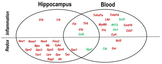 Inflammation and redox-related genes differentially and commonly expressed in the hippocampus and in the whole blood of AT mice vs. WT controls. Only genes with |FR| > 1.8 and p < 0.05 are reported. Red font indicates up-regulated and green font down-regulated genes.