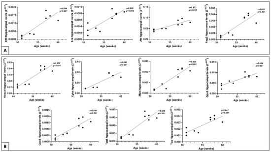 Correlations between the mRNA hippocampal levels of (A) inflammation and (B) redox genes with the age (in weeks) of AT mice (N = 10). Genes with |FR| > 1.8 and p < 0.05 were analyzed. The gene expression levels are presented as 2−∆CT values.