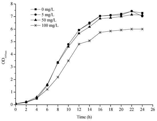 Strain RS20 was isolated from Chinese home-made fermented vegetables (Sichuan paocai) and identified as Lactobacillus plantarum by physiological, biochemical, and molecular biology (Supplementary Figures S1–S3 and Table S1). The growth curves of L. plantarum RS20 at different 3-PBA concentrations are presented as Figure 1. It can be observed that the growth patterns were essentially similar in the absence and presence of 3-PBA. The strain entered the logarithmic phase after about 4 h, which was reflected in the medium’s turbidity increasing rapidly. Then, a stable phase was reached at 16 h. However, 3-PBA exerted an adverse effect on bacteria to an extent when it was at a high concentration (100 mg/L), which was embodied as the growth rate significantly slowing down. This inhibition could be ignored when the concentrations of 3-PBA were 5 and 50 mg/L, indicating that L. plantarum RS20 demonstrated good tolerance to 3-PBA.