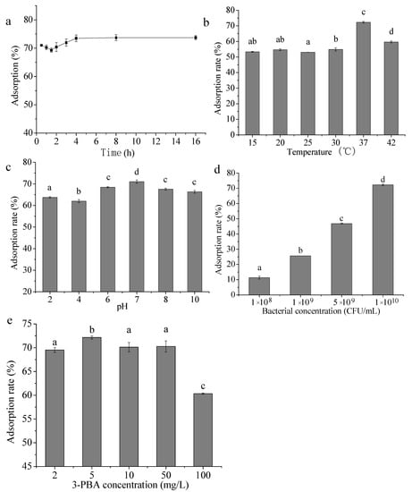 To sum up, the best demonstration could be attained by setting the conditions as follows: pH 6.0–8.0, incubation time of 8 h, and incubation temperature of 37 °C. Additionally, there was a positive correlation between the adsorption rate and cell concentration.