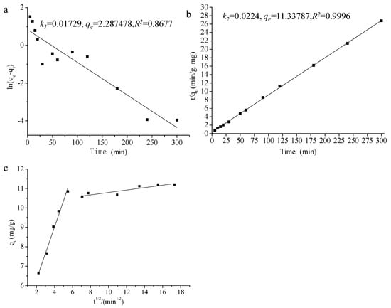 Kinetics models (pseudo-first-order, pseudo-second-order, and Weber–Morris intraparticle diffusion models) are usually used to depict the adsorption process and mechanism for traditional adsorbents [17,18]. The pseudo-first-order model and pseudo-second-order model are generally used to simulate the initial phase and all phases of biosorption [19], respectively. Figure 3a,b shows the pseudo-first/second-order model results of 3-PBA adsorption by L. plantarum RS20, among which the latter model showed a higher degree of fitting (R2 = 0.9996). 3-PBA adsorption by L. plantarum RS20 conformed to the pseudo-second-order model, and the equation could reflect more comprehensive and truer behaviors than the pseudo-first-order model. Therefore, it can be speculated that chemisorption is involved in 3-PBA biosorption and may be the rate-limiting step [20]. This is in line with the report of Zhang et al. [16] that cypermethrin adsorption by Saccharomyces cerevisiae followed the pseudo-second-order model, and similar results were also observed by Gohari [21].
