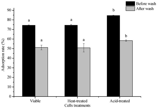 Figure 4 also shows that the adsorption rates in all treatment groups decreased (23%) after eluting with PBS buffer solution. This was the consequence of desorption, which indicated that non-covalent bonding (physical adsorption) existed during 3-PBA adsorption. This observation is consistent with the effect of pH on the adsorption rate, since the adsorption rate of 3-PBA significantly changed under pH 2.0–6.0, indicating that hydrogen bonding and ionic exchange may have been the main interaction forces binding the cell and 3-PBA. Similar results were reported previously by Shen et al. [29], where acrylamide was physically adsorbed by L. plantarum, which was closely associated with the cell wall roughness, hydrophobicity, nitrogen-to-carbon (N/C) ratio, and functional groups.