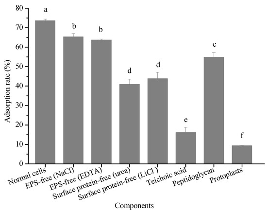 Adsorption abilities of different cellular components. Note: parentheses mean that different methods were used to remove EPS or surface proteins. Bars with different letters are significantly different (p < 0.05).