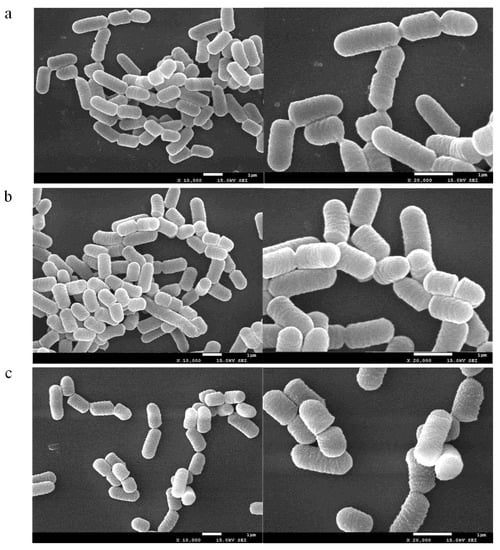 SEM photographs of L. plantarum RS20 biomass under three different 3-PBA concentrations ((a) control group, (b) 5 mg/L, and (c) 100 mg/L).