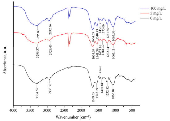 To better understand the surface adsorption mechanism, FT-IR analysis was employed to identify potential functional groups participating in 3-PBA removal by L. plantarum RS20 (Figure 7). Characteristic peaks were identified according to the references [33,34]. Compared with the FT-IR spectra of the control, the peak position of the bound 3-PBA shifted. The peak at 3304 cm−1 was the result of –OH and N–H stretching vibrations. The wavenumber shifted to 3296 and 3295 cm−1, respectively, after exposure to 3-PBA at 5 and 100 mg/L, indicating that –OH/–N–H contributed to 3-PBA adsorption. The peaks at 2933, 1658, 1545, 1454, and 1065 cm−1 generally shifted toward lower wavenumbers when 3-PBA was present. The absorption peak at 1445 cm−1 was in the amide II region, and it corresponded to a combination of the N–H in-plane bending and the –CN stretching vibration [35]. The peaks at 1407 cm−1 shifted to 1381 cm−1 and 1375 cm−1, which were assigned to amide III, indicating that amide promoted 3-PBA adsorption. The observed changes indicated that the –OH, –N–H, –C–N, and –C–O groups were involved in the 3-PBA biosorption process. These functional groups have also been reported to be involved in other xenobiotics’ bio adsorption, including cypermethrin, patulin, and Cd2+ [16,28,36].