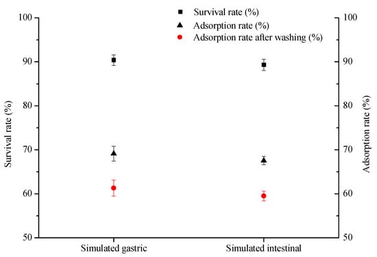 Considering that the application of lactic acid bacteria as probiotics in food and feed has great potential [37,38], we evaluated the tolerance of L. plantarum RS20 to the gastrointestinal tract via simulated gastric and intestinal juices. As shown in Figure 8, it can be seen that the survival rates of L. plantarum RS20 were more than 90% in simulated gastric and intestinal juices after treatment, indicating that this strain could tolerate the simulated GI tract conditions and remain relatively viable. Zoghi et al. reported that L. plantarum has a high ability to remove patulin under GI conditions [39]. In comparison with intestinal juice, the 3-PBA adsorption ability was higher after gastric juice treatment, which is consistent with the previous results that acid treatment could enhance the adsorption capacity (Section 2.5.1). Meanwhile, a low quantity of 3-PBA was released after washing, which suggests that strain RS20 can safely remove 3-PBA when added to food or feed. These findings are in agreement with the study of Zhao et al., where Leuconostoc mesenteroides DM12 exhibited a high adsorption rate in a simulated gastrointestinal system [40]. Therefore, L. plantarum RS20 can survive and remove 3-PBA in simulated digestive juices, indicating that this strain is a promising adsorbent candidate for application in vivo.