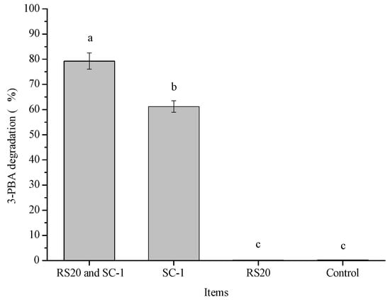 Degradation of 3-PBA by the cooperation of strain RS20 and strain SC-1. Note: Bars with different letters are significantly different (p < 0.05).