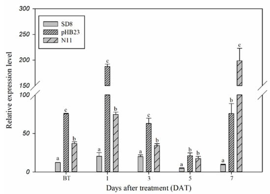 Expression levels of CYP77B34 in TS (SD8) and TR (pHB23 and N11) D. sophia plants before (BT) or 1, 3, 5 and 7 days after treatment (DAT) with or without tribenuron-methyl. 18sRNA was the reference gene. All data are mean ± SE of three replicates. Columns with different letters indicate that the relative expression level had a significant difference at the same time point (using one-way analysis of variance, combined with Dunnett’s post-test comparison, p < 0.05).