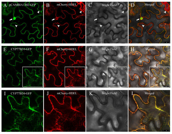 Subcellular localization of CYP77B34. In (A–D), pCAMBIA1302-GFP shown in green (A) co-expressed with the endoplasmic reticulum (ER) marker mCherry-HDEL shown in red; (B–D) are the bright-field and merged images, respectively. The arrows and arrowheads show the nucleus and the reticulate-structure ER. In (E–H), CYP77B34-GFP shown in green (E) co-expressed with mCherry-HDEL shown in red; (F–H) are the bright-field and merged images, respectively. Images (I–L) are the magnifications of the selected areas in (E–H). Scale bars: 25 μm in (A–H) and 10 μm in (I–L).