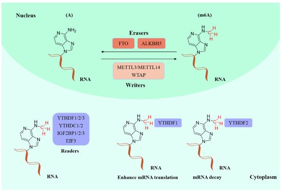 - Shi, H.; Wei, J.; He, C. Where, When, and How: Context-Dependent Functions of RNA Methylation Writers, Readers, and Erasers. Mol. Cell 2019, 74, 640–650. [Google Scholar] [CrossRef] [PubMed]