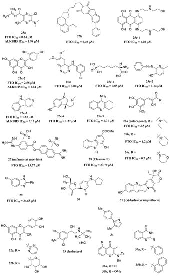 - Huang, Y.; Yan, J.; Li, Q.; Li, J.; Gong, S.; Zhou, H.; Gan, J.; Jiang, H.; Jia, G.F.; Luo, C.; et al. Meclofenamic acid selectively inhibits FTO demethylation of m6A over ALKBH5. Nucleic Acids Res. 2015, 43, 373–384. [Google Scholar] [CrossRef] [PubMed]