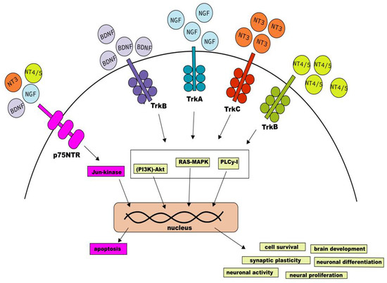 - Chao, M.V. Neurotrophins and their receptors: A convergence point for many signalling pathways. Nat. Rev. Neurosci. 2003, 4, 299–309. [Google Scholar] [CrossRef]