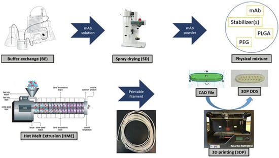 - Carlier, E.; Marquette, S.; Peerboom, C.; Amighi, K.; Goole, J. Development of mAb-loaded 3D-printed (FDM) implantable devices based on PLGA. Int. J. Pharmaceut. 2021, 597, 120337. [Google Scholar] [CrossRef] [PubMed]