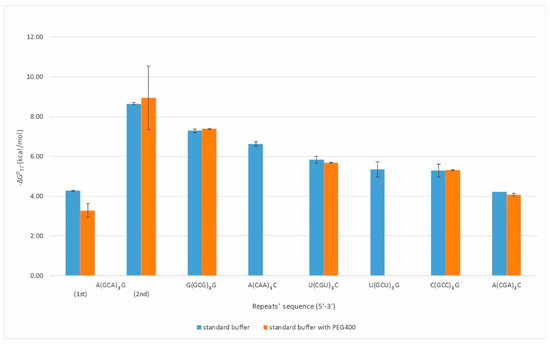 The results showed that the presence of the additional 200 mM of PEG 400 in the UV-melting buffer, already containing 100 mM sodium chloride, did not influence RNA structures formed by particular repeats. Moreover, the contribution of PEG400 to thermodynamic stability was also low, usually within 10% of original free-energy values.
