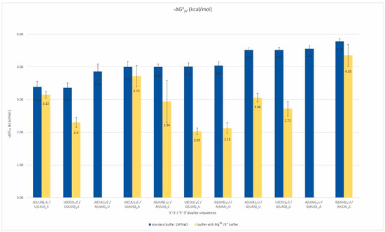 The free energy of those duplexes ranged from −3.4 to −4.8 kcal/mol, and their melting temperatures did not exceed 30 °C. About half of the analyzed duplexes melted in a two-state manner, which means that no intermediate states between the single-stranded form and the duplex were observed in the solution. For A, U, and C-rich repeats, the formation of a duplex is dependent on the types of mismatches occurring next to conventional Watson–Crick base pairs. For such duplex-forming repeats, the canonical, stabilizing pairs A-U may be insufficient to maintain a helix that contains highly destabilizing mismatches, e.g., C-C or A-A. For duplexes formed by such types of repeats, the G-U Wooble pair’s stabilizing role that supports these duplexes is significant. We observed a stronger destabilization of these duplexes in the presence of magnesium and potassium ions in comparison to the standard buffer, and the destabilizing effect was about 1.5–2 kcal/mol (Table S2). However, this trend was not a rule for repeats including G and C residues, for which the presence of magnesium and potassium ions stabilized duplexes formed by some repeat pairs. These observations suggest that single-stranded, AU-rich trinucleotide RNA repeats have a considerable potential for duplex formation, which is greater the less destabilizing the mismatches and the longer the repeats are.