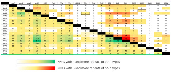 RNA repeats coexistence in a single transcript. The values on the crossing of particular repeats type row and column represent the number of RNAs found with the four (yellow–green scale) and the six (yellow–red scale) repeat number.