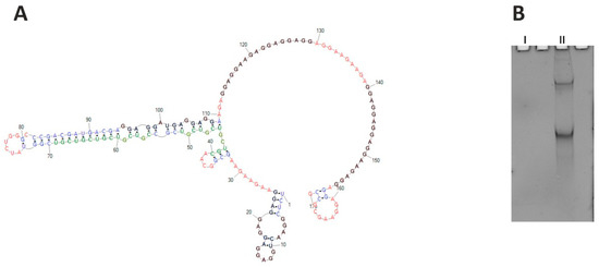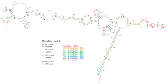 Secondary structure probability was performed using a partition function mode of the RNAstructure software. The results were visualized on the secondary structure with the lowest free energy. It was indicated that three hairpins show a very high probability of more than 99%, and one double-stranded region with internal loops (105–137 and 235–249) showed a probability higher than 95%. The TNR-containing helix structure showed a probability of more than 70%. The lower probability of base pairing in this region may suggest the potential lability of the helix and can be related to the dynamic function of this region. A three-dimensional model of the structure obtained in the RNAComposer program [34] showed that highly reactive nucleotides were often exposed outside the helix (Figure S2), which matches with their availability for mapping reagents.