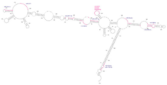 3′UTRs are widely known as regulatory regions containing target sites for microRNAs. In the context of the huge 3′UTR of GABRA4, we have searched miRDB [35] for miRNA target sites. As a result, we have identified 148 potential microRNAs, with a significant target score above 80, from which 11 different ones are localized at 13 sites within the domain of our interest (Figure 6 and Figure S3). Four of them target the repeats (two for UUG and two for UAA repeats); however, from these four only the UAA-targeting ones was reported in the miRBase, as experimentally confirmed by NGS methods [36,37,38]. Nine miRNAs target subdomain 1 and three target subdomain 2. About half of the matched miRNAs bind to conserved regions of the predicted secondary structure. The most interesting site in this structure seems to be the loop of highly conservative hairpin 268–284. This nine-nucleotide-long loop presented very high reactivity during chemical mapping and is also a target site for three different miRNAs. Such high accessibility of the miRNA target sites suggests the possible active regulatory function of this region.