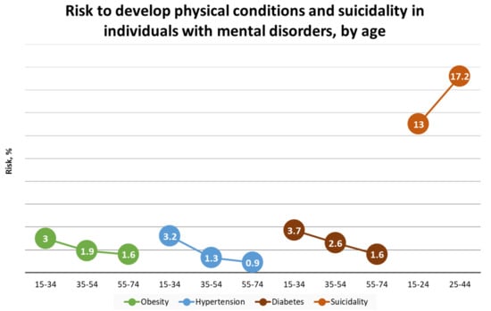 Risk of developing poor physical conditions and death from unnatural causes in individuals with mental disorders by age. Data on obesity, hypertension, and diabetes were extracted from The Health Improvement Network in 2018 in England, comprising 1,051,127 patients. Out of them, 9357 (0.9%) had a diagnosis of severe mental illness (SMI). The rate ratios of the prevalence were calculated between the SMI and all patients in three age groups, i.e., 15–24, 25–54, and 55–74 [17]. The standardized mortality ratio from suicide was calculated using 1,003,906 patients with hospital discharge with depression from a dataset of English national hospital episode statistics, linked with data from death records. The ratios were calculated comparing mortality in people with depression with mortality in the general population of England in two age groups: 15–24 and 25–44 years [18]. Reprinted/adapted with permission from ref. [19]. 2022, Diana M. Manu.