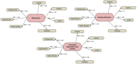 Associations between depression, anxiety, and comorbid depression–anxiety and chronic physical condition risk ratios (RR). Analytic sample comprised of 33,242 adults (51% women) with ages between 22 and 64 years, with no self-reported diagnosis of schizophrenia, psychoses, attention deficit hyper activity disorders, adjustment disorders, substance abuse disorders, and personality disorders. COPD = Chronic Obstructive Pulmonary Disease. Individuals were part of the Medical Expenditure Panel Survey annual releases of 2007 and 2009 in the United States. Data were published in [26]. Reprinted/adapted with permission from ref. [19]. 2022, Diana M. Manu.