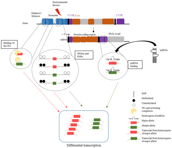 The interplay of SNPs, TFs, DNAm, and miRNA binding, leading to differential mRNA gene expression. SNPs, single-nucleotide polymorphisms; TFs, transcription factors; DNAm, DNA methylation; miRNA, microRNA. Reprinted/adapted with permission from ref. [19]. 2022, Diana M. Manu.