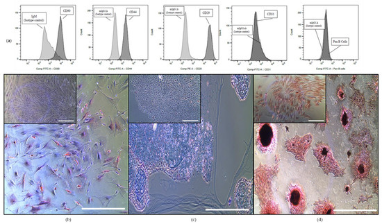 For the flow cytometry, cells were trypsinised at passage 2, and 1 × 105 cells per sample were washed with PBS +/+ supplemented with 2% FSC (Sigma Aldrich, F7524). The following monoclonal antibodies and respective isotype controls were used for the flow cytometry: PE-CD29 (Clone TS2/16, Mouse IgG, 1:50, Biolegend, San Diego, CA, USA), FITC-CD31 (Clone CO.3E1D4, IgG2a, 1:50, Biorad, Hercules, CA, USA), FITC-CD44 (Clone 25.32, IgG, 1:50, Biorad), Purified CD90 (Clone DH24A, IgM, 1:50, Monoclonal Antibody Center), FITC-PanB cells (Clone CVS36, IgG1, 1:50, Biorad). A total of 1 × 104 events were measured per sample.