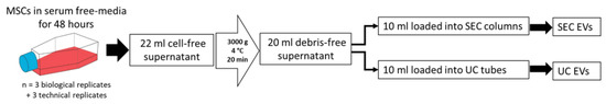 Illustration of the experimental setup: MSCs derived from the bone marrow of 3 equine donors were cultured in serum-free DMEM for 48 h (n = 3 biological replicates, plus 3 technical replicates per donor). Then, 22 mL of cell-free supernatant was collected from 8 × 106 cells per replicate and centrifuged in a 50 mL falcon tube with 3000× g for 20 min at 4 °C. In total, 20 mL of debris-free supernatant was recovered. Half of it was used to isolate EVs by the SEC columns, and the other half was filled into UC tubes.