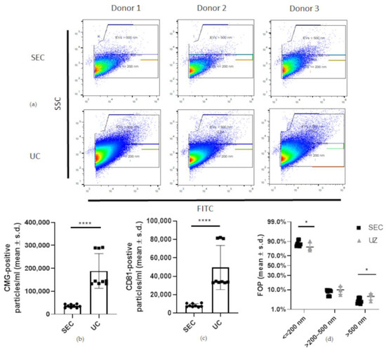 UC produced more particles of the desired size range (≤200 nm) per millilitre of supernatant than SEC due to its higher isolation efficacy. The size cutoffs for FT-FC were chosen based on a gating with fluorescence-labelled silica beads of defined sizes, which most closely approximated the dimensions of the different EV subtypes (small ≤200 nm, intermediate 200–500 nm and large >500 nm) [60]. The beads served as a size reference for the distinction of the EV subtypes to separate exosomes (the particles of interest for this study) from the other subtypes because exosomes (30–150 nm) have a defined mode of biogenesis and are highly interesting for regenerative applications, because they have been shown to play essential roles in intercellular communication [61,62]. EVs above that size are less homogenous in origin, e.g., particles above 500 nm are either apoptotic bodies, conglomerates of proteins or other contaminants which are not desired and are characteristic of poor EV isolates [51]. More particles stained positive for CMG than CD81 because this dye incorporated into the lipid bilayer, which was present in all EVs, rather than detecting a tetraspanin like CD81, which was enriched on EVs and not obligatorily present on all EVs [63,64].