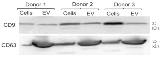 Whole-cell lysates and the EV populations enriched by UC were analysed using a Western blot to check for the presence of tetraspanins using human anti-CD9 and anti-CD63 antibodies. Indeed, the equine MSCs and isolated EVs showed positive signals for these two tetraspanins, which are markers of membrane proteins commonly found across all cell and EV types (Figure 5).
