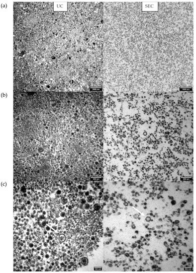 Transelectron Microscopy (TEM) images of the UC EV isolates in the left panels and the SEC EV isolates in the right panels taken at decreasing (top to bottom) magnifications: (a) 12,000× magnification gives an overview of the different sizes of the particles with a 1000 nm scale bar; (b) 50,000× magnification shows the different electron densities by different grey scales; (c) 85,000× magnification shows clearly the EVs identifiable by their lipid bilayer (arrows). In the UC isolates, the size distribution of the EVs is heterogeneous, ranging from large particle agglomerates to small EVs. In contrast, in the SEC isolates, particles are more uniformly sized without agglomerates.