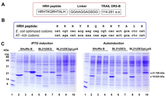 2.1. Heterologous Expression of HRH–DR5-B Fusion in Escherichia coli Strains